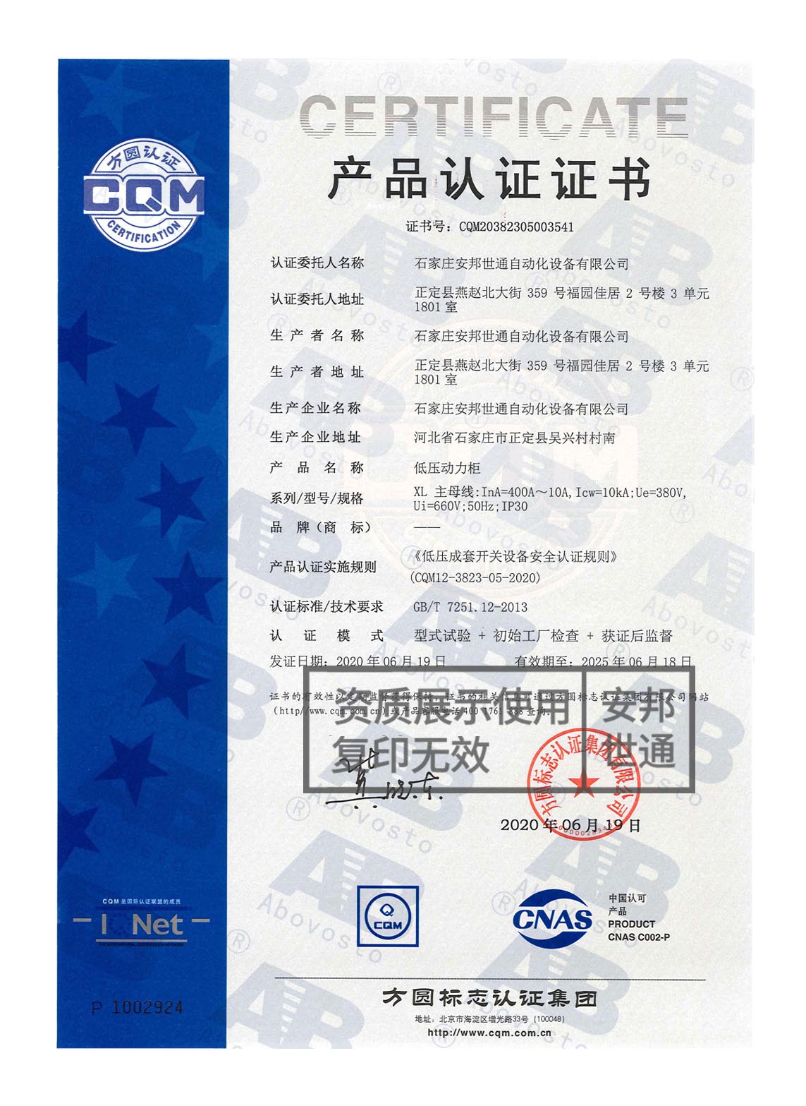 低壓動力柜-產(chǎn)品認證證書