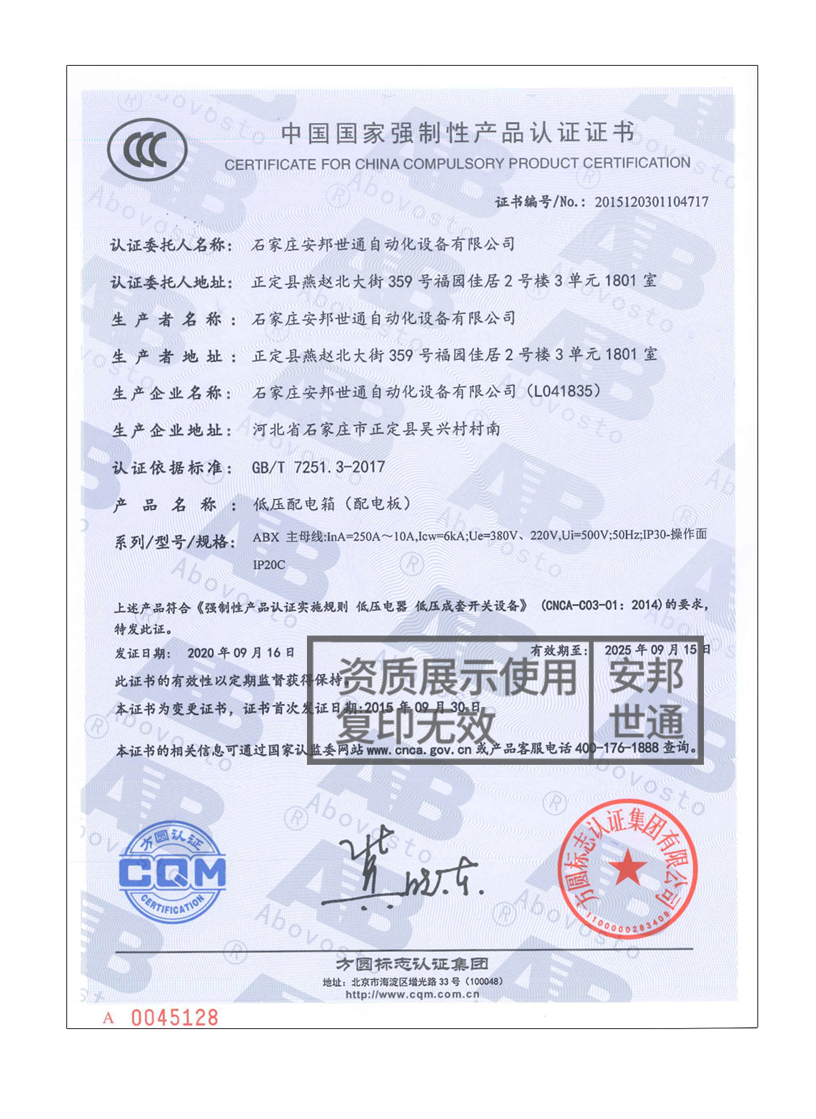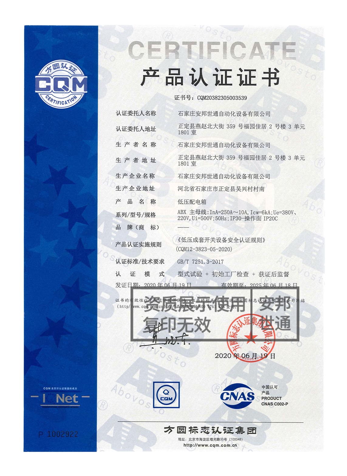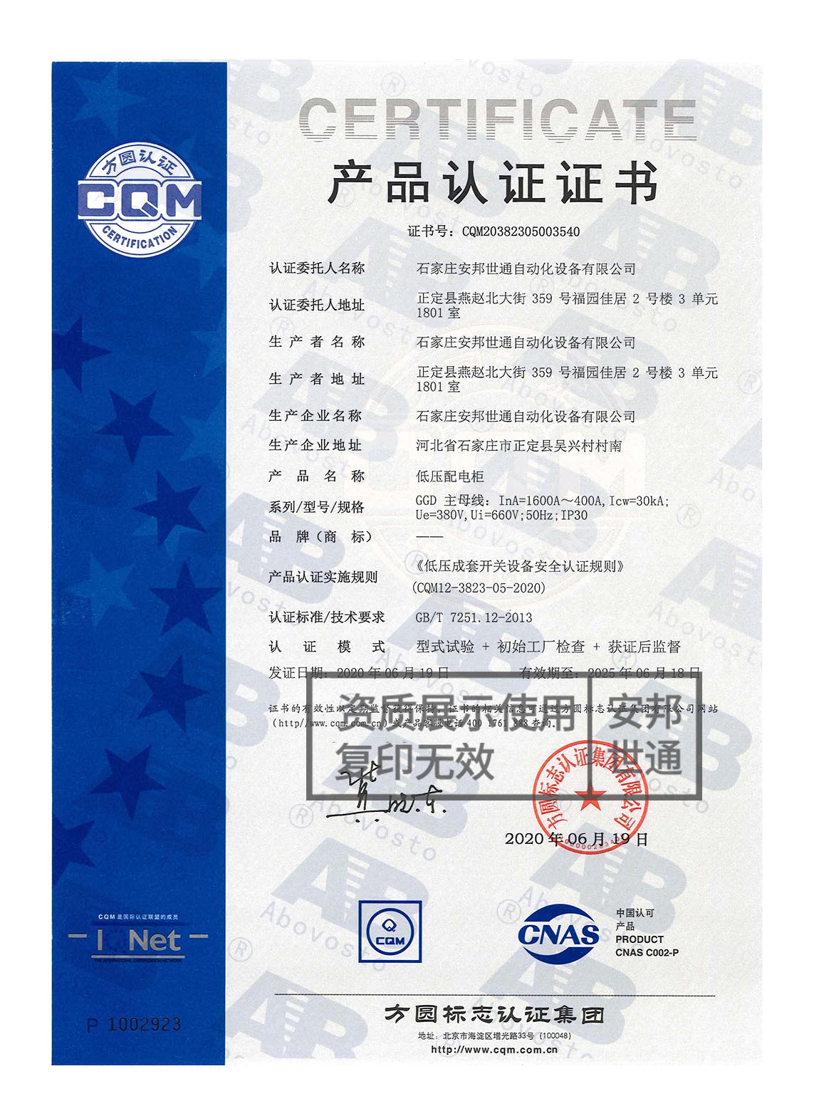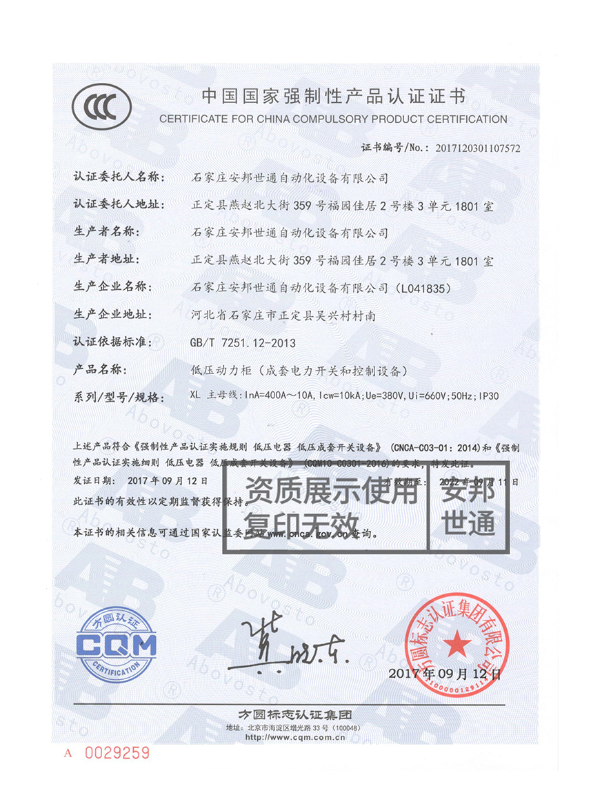 低壓配電柜-產(chǎn)品認證證書